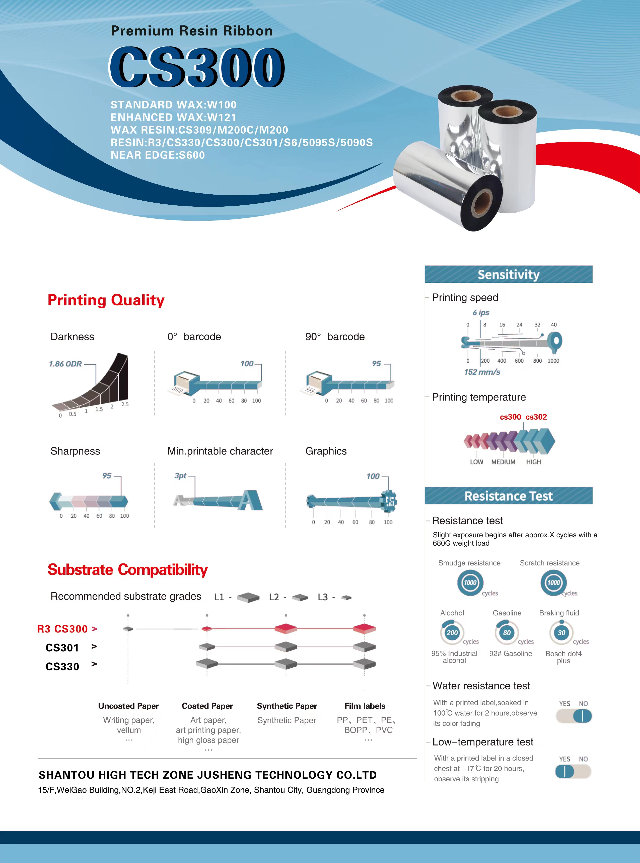 CS302 PREMIUM RESIN RIBBON offers maximum durability for demanding industrial applications where resistance to extreme abrasion, heat and/or chemicals is required. In addition, our premium resin ribbons operate at lower print head energy settings, allowing you to extend print head life and reduce maintenance.